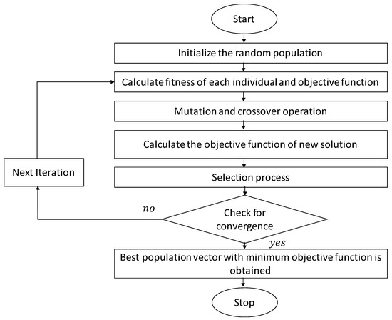 DE is mainly used for the minimization of non-continuous, nonlinear, and nondifferential space functions, along with noisy, flat, multidimensional, time-dependent objective functions and constraint optimization issues. Figure 1 indicates the operational flow of the DE algorithm, which mainly consists of three main operation sections, namely, mutation, crossover, and selection.