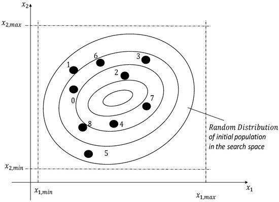 Each parameter of the candidate solution is restricted within a range as specified below, f(Xi). , and . The initial population covers the search space with uniformly random individuals constrained with the abovementioned restrictions, thus forming the candidate solution distributed randomly as illustrated in Figure 2.