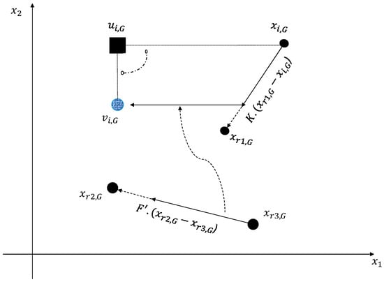 The DE algorithm is rotationally invariant in terms of the recombination process, in which the new trial vector generated is replaced by either a binomial crossover operator, which generates a trial vector by linearly combining the target vector and the corresponding donor vector or an exponential crossover as highlighted in Equation (3). The variables represent the randomness of the system and have a range of . Figure 3 indicates the process through which the trial vector is obtained with respect to the DE search algorithm, as shown in Equations (4) and (5):