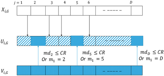 After generating the mutation vectors, they are combined with the target vectors through a non-uniform crossover operation for the formation of trial vectors. Equation (3) shows the crossover operation and illustrates the successful combinations that enable the optimization algorithm to recommend improved solutions of the optimized search process: