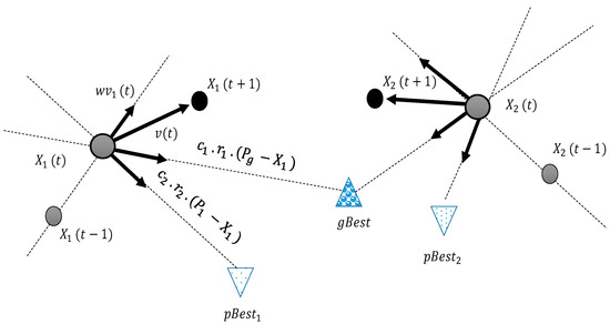 and are updated throughout the optimization process in each iteration. To do so, we define a fitness function to evaluate the location of each particle at each step. The mathematical form of obtaining the velocity and updating the location of each particle is shown in Equations (7) and (8), respectively. Particle optimization continues until the stopping conditions formulated according to several factors, such as system complexity, accuracy required, and response time.