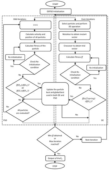 The DE in DEPSO comes into the picture here as it adds a feature to the conventional PSO algorithm to explore and exploit the search space efficiently and avoid individual particles stuck in the local optima [43]. Therefore, the proposed system uses the PSO and DE algorithms efficiently by using a PSO-based optimization for each odd iteration and DE-based optimization strategy for each even iteration. Figure 9 depicts the flowchart or the state diagram to illustrate the DEPSO algorithm, where represents its fitness function.
