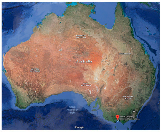 - Google Maps. Google Maps. 2018. Available online: https://www.google.com.au/maps/place/Deakin+University,+Geelong+Waurn+Ponds+Campus/@-26.0729556,134.9047233,3651365m/en (accessed on 23 April 2018).