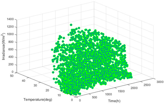 The PV system has a peak power of nearly 3 kW and comprises 12 PV modules at approximately 250 W each. The logged climate data are solar irradiance, air temperature, and relative humidity. An intensive impact analysis of the weather data was carried out during the study. Solar irradiance and temperature were considered as the primary input variables due to the insignificant impact of relative humidity deemed in this study. The generated output power of the PV system was also recorded using a self-sufficient data acquisition system, which acted as a self-energized data logger connected to the output terminal of the inverters in the PV system. Data collection was carried out for a period of about 15 months from the 1 July 2014 to the 30 September 2015. Due to the power interruption of the data logger, the overall data were collected for 293 days and then used in the training and validation processes of the proposed forecasting technique in the later stages. Figure 13 shows the system’s hourly weather data and power output during this period as recorded in the self-energized data logger system. Figure 14 shows the relationship of measured solar irradiance and air temperature during the data collection period as a function of hourly sampled time.