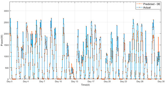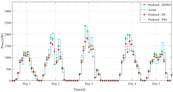 The results presented in Table 5 showed that the proposed DEPSO performed better than the PSO and DE techniques. The MRE value for the DEPSO technique for the 1 h time horizon was 3.1%, demonstrating that the presented algorithm accurately forecasted the output power of the PV system. The average RMSE value of the proposed DEPSO method was 4.4%, which satisfies the industrial requirement of RMSE less than 20% [48].