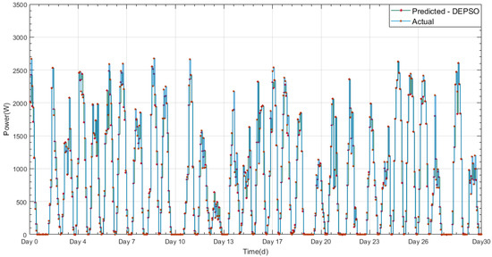 DEPSO-forecasted and actual values of PV output power.