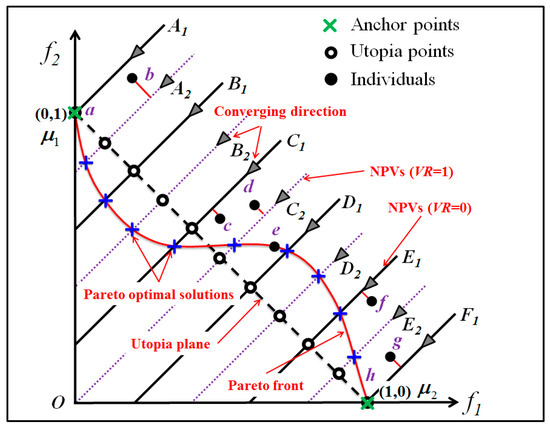 In MODE/D&P, a series of uniformly distributed reference vectors are set up in the objective space for preserving population diversity [32,37]. These vectors are established in a hyper-cube with a unit size 1, thus are called normalized reference vectors (NRVs), as shown in Figure 4. Anchor points (μi) are fixed at locations on axes with an intercept of 1 and a plane (known as utopia plane) is established by connecting these anchor points. For two- and three-objective optimizations, utopia planes are a straight line (Figure 4) and a regular triangle, respectively. For an optimization over three objectives, utopia plane appears in the form of a simplex hyperplane [38]. Then, utopia points, a set of points located on the utopia plane, are generated by weighting the anchor points using the following equation [38]: