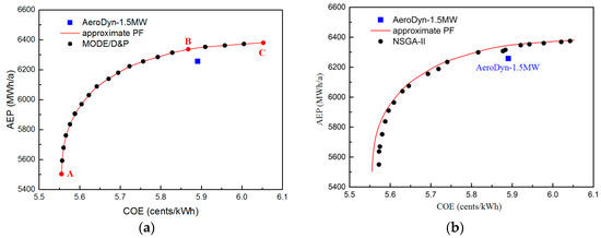 Figure 6 shows the distributions of Pareto optimal solutions obtained using the MODE/D&P algorithm and the NSGA-II algorithm. The corresponding values of the AeroDyn-1.5MW blade are also included. The distributions of the Pareto optimal solutions follow a monotonically increasing curve, showing that there are conflicts between the two objectives. The approximate uniform distribution of the optimal solutions is achieved using the MODE/D&P algorithm, indicating that the uniform decomposition mechanism of the proposed algorithm is very effective. The optimal solutions obtained using the NSGA-II algorithm exhibited slight aggregation in local areas, as shown in Figure 6b, and does not converge to the approximate PF (indicated by the red line), which is obtained by fitting the optimal solutions from the proposed algorithm using the third order spline, demonstrating inferior convergence performance compared to the proposed algorithm.