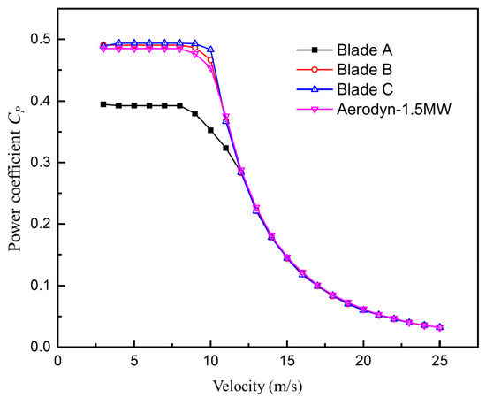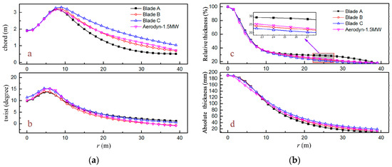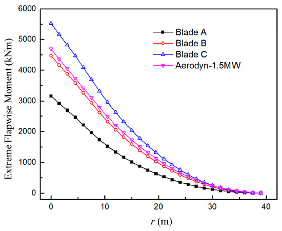 To explain the reason of the PF formation of wind turbine blade design, the blades A, B and C are selected as samples from Figure 7a for further illustration. Figure 7 shows the distributions of chord, twist, relative thickness, and absolute thickness of Blades A, B, and C based on the optimal solutions obtained using the proposed algorithm, as well as the AeroDyn-1.5MW blade. The power coefficients and extreme flapwise moments of the four blades are given in Figure 8 and Figure 9, respectively. There are two possible reasons for the differences between Blades A and B. First, the AEP of a blade is related to the chord, twist, and relative thickness distributions. The chord of Blade B is larger than that of Blade A, but its relative thickness is relatively smaller. These factors are all beneficial to improve the power output of Blade B, resulting in higher AEP of Blade B. Second, the COE is related to extreme load and AEP. The AEP of Blade C is only 15.1% higher than that of Blade B. The extreme flapwise moment of Blade B is significantly 41.5% higher than that of Blade A due to the larger chord and smaller relative thickness, resulting in significantly increased overall turbine cost. As a result of the contradictory factors mentioned above, the COE of Blade B is obviously larger than that of Blade A. For comparisons between Blades B and C, as well as Blades A and C, the same trends are observed, and therefore such a monotonous increasing curve PF is produced.