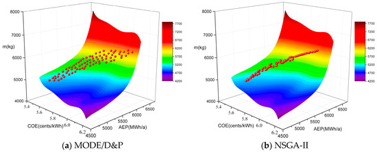 The objectives of the two-objective design are the minimum COE and maximum AEP, and population size and evolution generation are set to be 20 and 300, respectively.