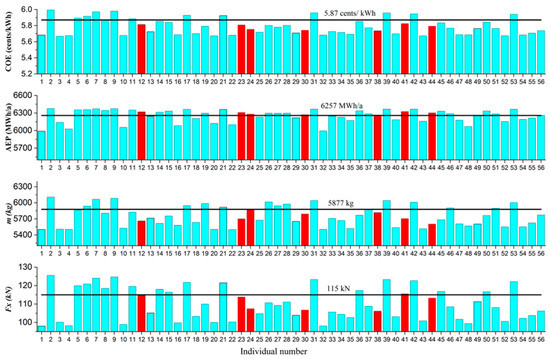 The objectives of four-objective designs are the minimum COE, maximum AEP, minimum blade mass, and minimum extreme root thrust. The population size and evolution generation are set at 56 and 700, respectively. Only quantitative analysis is conducted here, as the distribution of the Pareto optimal solutions obtained in the four-objective optimization cannot be displayed in 3D space. The Pareto optimal solutions obtained using the MODE/D&P algorithm is given in Figure 11, where the four values are also displayed based on the AerDyn-1.5 MW blade (COE = 5.87 cents/kWh, AEP = 6257 MWh/a, blade mass = 5877 kg, extreme root thrust = 115 kN) for comparison. As can be seen in Figure 11, blades 12, 23, 24, 30, 38, 41 and 44 (in red) exhibit improvements in all objectives compared to the AerDyn-1.5 MW blade and thus are regarded as optimal solutions in this study.