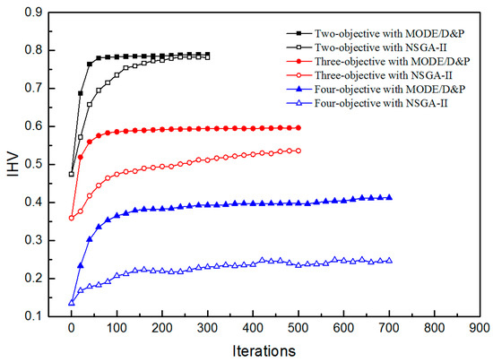Figure 12 presents the dimensionless IHV of each evolution process in the two-, three-, and four-objective optimizations using the MODE/D&P and NSGA-II algorithms. As can be seen, the IHV obtained using the MODE/D&P algorithm is significantly higher than that obtained using the NSGA-II algorithm in all the multi-objective optimizations, suggesting that the proposed algorithm is significantly effective in convergence over the NSGA-II algorithm and this superiority increases with the increased number of the optimization objectives.