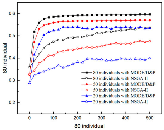 Population size reduction of an evolutionary algorithm is an effective way to improve the optimization efficiency. Based on the three-objective optimization of wind turbine blades, Figure 13 depicts the IHV of 500 generations obtained using the MODE/D&P and NSGA-II algorithms with population sizes of 80, 50 and 20.