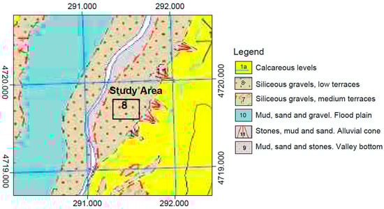 Figure 2 shows the geological characterization of the area where the research is set. The geological formations play a fundamental role in the process of thermal exchange between ground and the heat carrier fluid. For this reason, geology is subsequently required during the process of calculation of the future geothermal district heating system. Parameters such as the total drilling length or the heat pump power are closely related to the capacity of the ground to conduce the heat (thermal conductivity of the ground). Table 2 presents the parameter of thermal conductivity for each of the geological formations described in Figure 2.