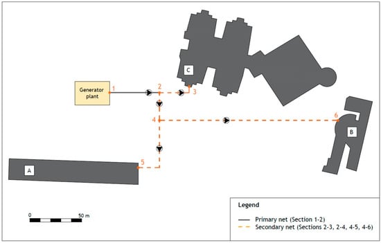 The central installation was planned to follow a branched pattern (fishbone schema) where each building was connected to the same generator plant by a single supplying network. The structure of the fishbone schema can be found in Figure 3. This figure presents an initial schema of the primary and secondary nets that constitutes the projected district heating plant.