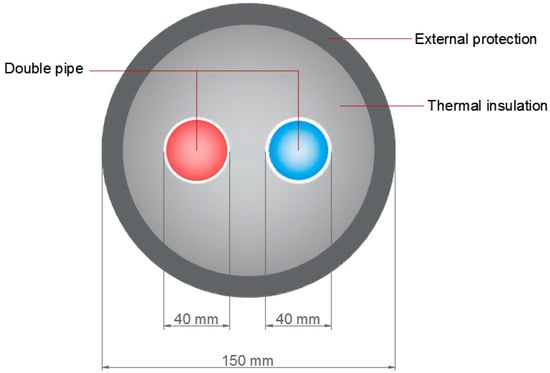 Since it was designed to just cover the heating needs, the circuit consisted of a double pipe pattern. In this system, one of the pipes is responsible for transporting the fluid to each building which returns through a second pipe to the main plant. Both pipes were properly insulated and protected, as Figure 4 shows.