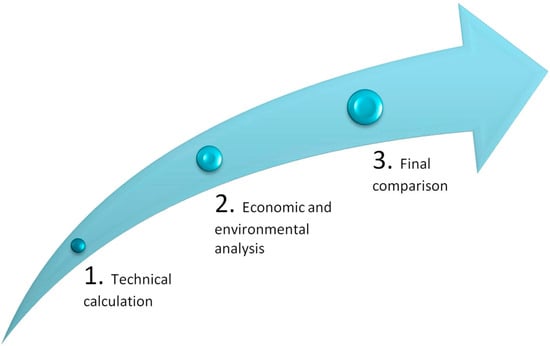Initially, the proposed solutions previously described were technically calculated. The dimensioning of the district heating system derived from the thermal and geological description presented in the above section. Afterwards, an economic analysis of each option was also established. Once known this information, the proposed solutions (case 1, 2 and 3) and the existing installation were properly compared and evaluated. By way of clarification, the following Figure 5 describes the workflow followed throughout this research.