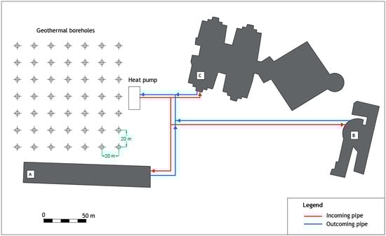 Once introduced the particular data of the system in question, EED evaluates the main parameters of the geothermal installation. In this way, the heat pump power and the number and length of boreholes required to cover the specific demand were calculated. During the process of calculation, the software suggests a series of alternatives. For the present assumption, the most optimal option (the first one) was selected so the installation requires a heat pump power of at least 330.62 kW and 49 boreholes of 178 m depth spaced every 20 m. The general distribution of each of the components of the geothermal district heating is presented in Figure 6.