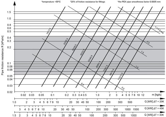 Nomogram of pipe friction resistance-flow-velocity for PEX-a pipes [29].