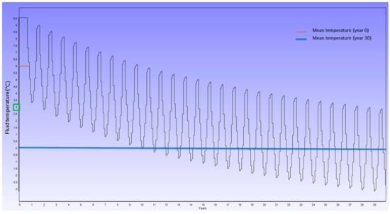 Most of the energy consumption derives from the heat pumps working. The excellent coefficient of operation (COP) of these devices allows them to provide a notable quantity of thermal energy consuming a minor amount of electricity. For the present case, two heat pumps of 180 kW (produced by ENERTRES, Galicia, Spain) connected in series provide a total of 360 kW that thoroughly cover the demand of 330.62 kW previously calculated. According to the manufacturer’s data, the power consumption of each of these devices is 40.92 kW, given the high COP (4.27) they have. This COP was calculated from the mean temperature of the fluid simulated with EED software for a thirty years operational period. From this simulation presented in Figure 8, the mean temperature of the fluid (3 °C) was estimated in order to obtain the mentioned COP for that period and according to the European Normative UE 813/2013 [31].