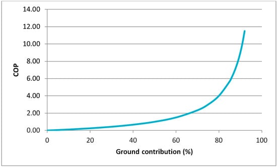 Heat pumps will be operational during 9 months a year for an average of 10 h a day (considering the climatic conditions of the area and the use of the buildings). It means an electrical use of 220.968 kWh/year for the set of geothermal heat pumps. It is important to clarify that the high seasonal COP is possible thanks to a combination of different factors. The heat pumps connection (in series) increases the COP of the second heat pump, this fact joined to the favourable geological and hydrogeological ground conditions result in an improvement of the global COP. Additionally, the ground/heat pump contribution ratio shoots up the COP with a small ground contribution increase. This fact can be observed in Figure 9.