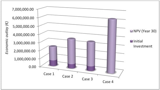 Every term of Equation (2) is negative given that initial investment and operational costs are both outlays and there are no positive cash flows. Additionally, it must be mentioned that a discount rate of 1.8% has been used in all the calculations. The operational costs for case 4 presented in this Table 13, are exclusively those corresponding to the use of natural gas.