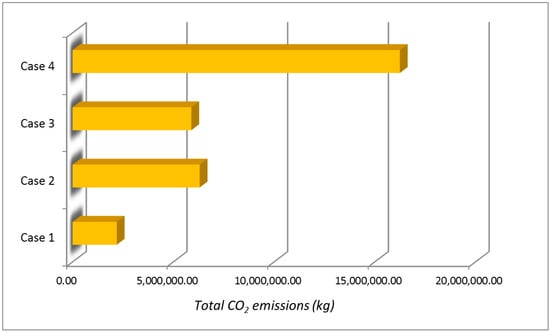 At same time, from the annual environmental analysis previously presented in Section 3.3, it was possible to estimate the total CO2 emissions accumulated at the end of the period considered (year 30). In this way, Figure 11 schematically shows the mentioned parameter for each of the cases described in this study. From the economic and environmental comparisons expounded above, a series of statements can be made: