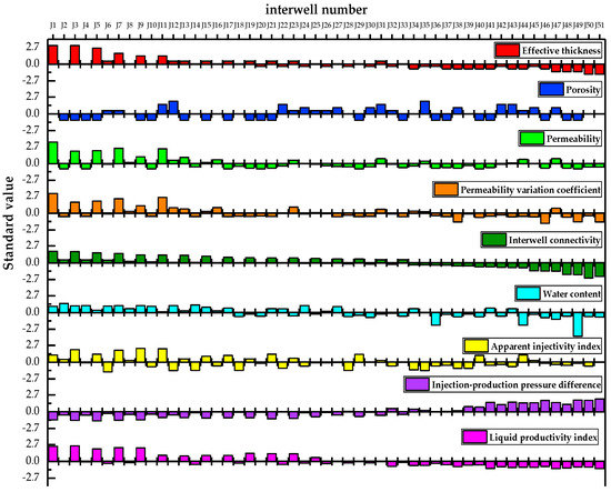 The correlation coefficient matrix (Table 4) shows that the injection-production-pressure has negative correlation with the other eight evaluation indexes. This is because with the thief zone, the flow resistance of the fluid through the formation decreases resulting in decreased injection-production-pressure. At the same time, an evident negative correlation between injection-production-pressure and interwell connectivity indicates that pressure plays a significant role in driving fluid flow to a local area. A clearly positive correlation between permeability and permeability coefficient is observed for the remaining eight evaluation indexes. This is because the permeability coefficient is obtained by the ratio of the permeability standard deviation and the average permeability, but the physical meaning of these two evaluation indexes is different. Permeability is mainly used to evaluate the development of the thief zone near the well, while the permeability coefficient is used to evaluate the heterogeneity of the entire formation.