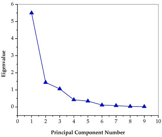 The PCA method cannot accurately extract and analyze the development of the thief zone in the same class. In order to improve the accuracy of the evaluation results using PCA, the MLWPCA method was constructed. Firstly, nine indexes are classified according to the result of factor analysis. According to the principle of cumulative contribution rate, greater than 75%, two factors are selected. The contribution rate is 61.104% and 15.919% respectively. The rotated load matrix is shown in Table 5. The score coefficient matrix obtained by the maximum orthogonal rotation method shows that the load values of x1, x3, x4, x7 and x9 evaluation indexes are higher in factor 1. These indexes are grouped into index subsystem 1. In factor 2, x2, x5, x6, x8, the index load is higher. These indicators are divided into index subsystem 2. Using Equation (8) for weight calculation the weights of subsystem 1 and 2 are 0.777 and 0.223, respectively.