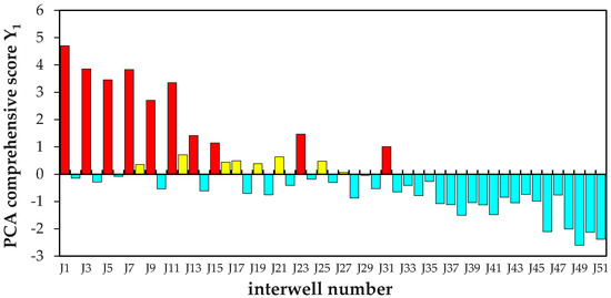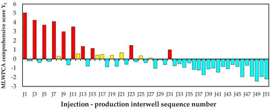 According to the scores of principal components, the comprehensive evaluation scores Y1 (shown in Table 4) of the thief zone between injection and production wells in Daqing oilfield are obtained, ranging from −2.600 to 4.704. The thief zone developed with the increase of comprehensive score. When the comprehensive score is negative, the seepage channel between injection and production wells is in good condition and the water drive power is sufficient. When the comprehensive score is greater than 0.0 but less than 1.0, the thief zone is moderately developed. At this time, close observation and appropriate measurements are needed to avoid further development into a big pore throat. When the comprehensive score is greater than 1.0, the thief zone is well developed and water channeling has occurred. A large amount of injected water is circulating inefficiently between injection and production wells. According to Figure 4, the Daqing oilfield has 10 well developed thief zones, accounting for 19.61% of the total number of thief zones; and eight moderately developed thief zone, accounting for 15.69% of the total number of thief zones. Improvements, such as profile control and water plugging, are needed for the injection-production wells with thief zones to avoid further development which may influence the final recovery ratio of the oilfield.