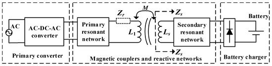 A WPT system typically has two coils at its heart that exchange energy from the transmitter to the receiver using high frequency magnetic links. Coils are compensated to improve power transfer efficiency. Primary compensation circuit boosts and filters the transmitter coil current, allowing the inverter of a relatively low volt-ampere (VA) rating to drive a highly inductive coil. The secondary compensation coil enhances power transfer by boosting the voltage and/or current at the secondary side [22,23,24]. As shown in Figure 1, the primary side consists of a rectifier, an AC-DC-AC converter that transforms the power frequency alternating current (AC) to high frequency AC current to increase the magnetic field density and system power capacity. In the secondary side, a high frequency rectifier is used to rectify and transform the AC power provided by the secondary coil to a suitable direct current (DC) for typical DC loads. The secondary converter could be omitted for smaller size, particularly if the power could be regulated by primary side.