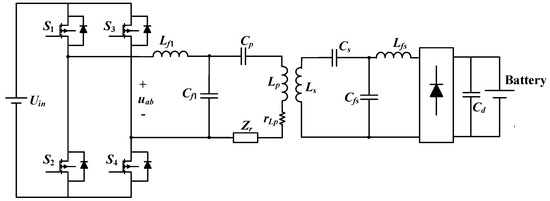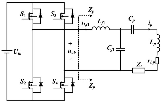 In the dynamic wireless charging system, coils alignment is inevitable as the secondary coil moves with the online electric vehicles, resulting in the mutual inductance variation, which thus causes fluctuation of charging power. Besides, in order to maintain the system stability, a constant supply current for primary coil is necessary. Consequently, meticulous control and tuning of the inverter are needed to alleviate these obstacles. This, however, increases the control complexity and reduces operation reliability of system with basic series-series (SS) compensation topology. Later, a novel compensation topology, namely inductor-capacitor-capacitor (LCC) resonant network, was derived from the inductor-capacitor-inductor (LCL) topology and used in EV dynamic wireless charging systems [25,26]. It performs as a current source at resonance frequency [27,28] and is able to cancel the nonlinear effect of the rectifier diodes in the secondary side to achieve an exact unit power factor under a predetermined load condition [29]. Besides, it improves the lateral coils misalignment tolerance. The comparison study on SS and double-sided LCC compensation topologies [30] revealed that the double-sided LCC compensation topology is less sensitive to mistuning caused by the coils misalignment. Besides, both the voltage and current stresses on the series compensated capacitors and the main coils of the double-sided LCC compensation topology are smaller than those of the SS compensation topology. Thus, the LCC network is selected in this paper. A typical LCC topology in the primary side is shown in Figure 2. A voltage-fed, full-bridge converter is composed by Metal-Oxide-Semiconductor Field-Effect Transistors (MOSFETs) S1–S4. Cf1 is the compensating capacitor for freewheeling inductance Lf1; Cp partly compensates primary coil Lp; rLp is the internal resistance of Lp; Zp is the output impedance of the inverter; Uin is the input DC voltage; uab and iLf1 are the output voltage and current of the inverter, respectively; ip is high-frequency current in the primary coil.