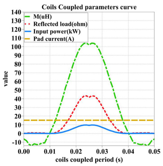 Figure 3 simulated the process of an EV passing one specific primary pad within 50 ms. It is very clear that with the EV moving, the variation tendency of three curves, M, Zr, and Pin, are completely consistent. Because of over coupled [31], M does not reach the maximum value when the two coils are totally aligned. If two coils overlap very little, the magnetic flux generated by them are added destructively and the negative inductance appears during initial and final periods [32]. The RMS of ip is independent of any variation, which always keeps a constant. The simulation results verified that the Pin is monotonically increase with M.