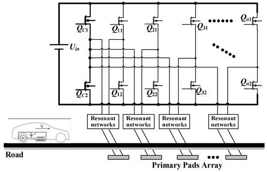 Another issue is the cost. For conventional dynamic WPT systems, each primary pad should be excited by an independent primary converter, and each primary converter contains at least two stages of sub-converters, including a DC-DC converter, a DC-AC converter, and their corresponding Pulse Width Modulation (PWM) drivers. In pads array dynamic WPT systems, for radiation safety and efficiency and cost consideration, primary pads are placed along the road side by side [17], whose sizes are normally no larger than 1 m [18]. Because the charging road usually extends hundreds of meters, numerous independent primary converters will be consumed, and the hardware cost will be unaffordable.