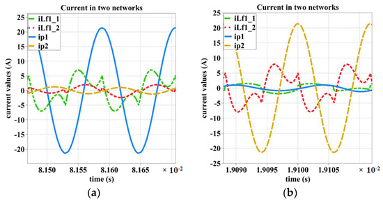 It can be seen that when the secondary coil is aligned with the first primary pad, the phase shift angle in the first selectable leg is 0 degree to maximize the charging power, so the first selectable leg is operating at charging mode, in which case the RMS of ip1 is 15.2 A, and the RMS of the first-order harmonic of iLf1_1 is 4.1 A. Meanwhile, the second primary pad is decoupled, so the phase shift angle in the second selectable leg is 175 degree and it operates in stand-by mode, in which case the RMS of ip2 is only 0.8 A and the RMS of the first-order harmonic of iLf1_2 is 0.7 A. The corresponding current waveforms are shown in Figure 6a. With the EV moving, the secondary coil passed the first primary pad and aligned with second primary pad. Contrary to the previous state, the first selectable leg is switched to stand-by mode while the second one is switched to the charging mode. The current waveforms are shown in Figure 6b, which almost resembles Figure 6a. The simulation results proved the theory analysis that each selectable leg in the proposed multiple legs inverter could regulate the injected power and pads current independently, and the total power loss could be significantly reduced with proper control.