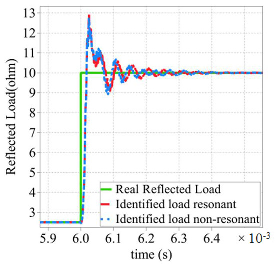 In Figure 7, the current RMS is sampled 50 times in each switching period. In the simulation, the reflected load is switched from 2.5 ohm to 10 ohm (load variation rate is up to 400%) at 6 ms, which is represented by the green solid curve. The blue dash line and red dash line are the identified reflected load curves when the system operates at resonant and non-resonant conditions, respectively. From the simulation results, it can be seen that even though the primary pad inductance changed from 300 μH to 275 μH, in which case the system operates at non-resonant condition, it has no influence on the identification result. The response time of the load identification is only about 200 μs, which is much faster than the conventional communication technology. According to the simulation results, it can be concluded that the proposed identification method has a high frequency robustness, fast response time and high identification precision, meeting the requirements of semiconductors protection and injected power control.