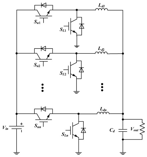 In Figure 8, Su1 to Sun are the upper IGBTs of each phase. Correspondingly, SL1 to SLn are the lower IGBTs of each phase. Ld1 to Ldn are the buck inductors and Cd is the common output filter. Vin and Vout are the input voltage and output voltage respectively. Each sub-buck can operate independently, and the phase shift between the adjacent sub-bucks is 180/n, where n is the number of the sub-buck converters.