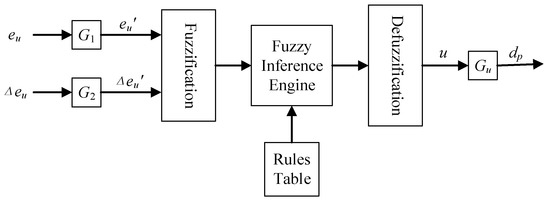 From Figure 9, it can be seen that the fuzzy controller consists of six major parts, i.e., input scaling factor (G1 and G2), fuzzification, fuzzy inference engine, rules table, defuzzification and output denormalization factor Gu. The inputs of the fuzzy controller are defined as the error of output voltage eu(k) and the change of error Δeu(k).