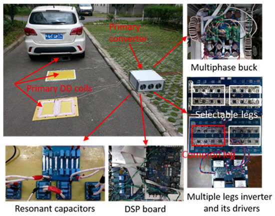In Figure 13, double D (DD) coils [38] are adopted both in the primary side and the secondary side to improve the misalignment tolerance. Three primary DD pads are paralleled side by side to compose the primary pads array which is activated by a sole multiple legs inverter. The distance between the two adjacent coils is 1 m. The components’ parameters in three primary LCC resonant networks are approximately identical with each other, as shown in Table 3. The multiphase buck contains three phases sub-buck circuit, and the phase angle between each two phases is 120 degree.