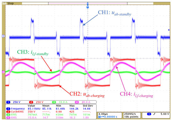 Voltages and currents for different operating modes. CH1 (250 V/div): Input voltage of the stand-by resonant network; CH2 (250 V/div): Input voltage of the charging resonant network, uab = 350 V; CH3 (10 A/div): Input current of the stand-by resonant network, iLf1 = 0.76 A; CH4 (20 A/div): Input current of the charging resonant network, iLf2 = 15.8 A.