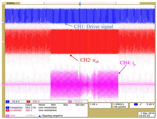 Power regulation process for one primary resonant network. CH1: One driver signal for inverter; CH2: Output voltage of the inverter, uab = 365 V; CH4: Primary pad current.