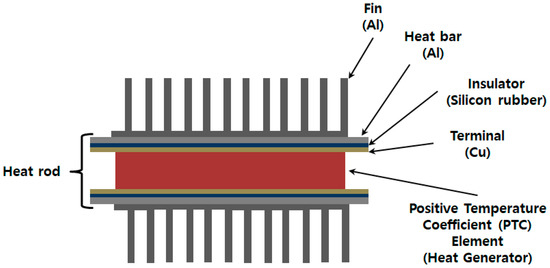 The performance of an air-heating electric heater is significantly affected by the structural designs of heat rods (Figure 1) and fins. Heat transfer is caused by the dispersion of wake flow which occurs as a result of periodic friction in the boundary layer between air and fin. Accordingly, if the finite area of fin increases, heat transfer is improved; however, this also increases friction and drag, which facilitates a drop in pressure [12]. As mentioned above, the heat transfer mechanisms are under development not only in heaters but throughout various fields, such as nanoscales [13,14]. Any successful design must satisfy the requirements for heat transfer and pressure drop as well as the weight reduction of components, which have great effect on the fuel economy of EV. An analytical approach can effectively consider these factors.