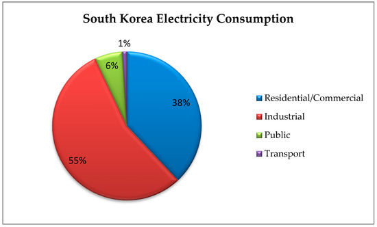 In recent years, our homes have been getting smarter with connected and remotely communicating devices. In order to save household energy, the Internet of Things (IoT) also called the “next great disruptor” is emerging as a significant digital revolution [5]. In South Korea, the smart home industry has come a long way since 2003. It was the time when the apartment owners focused on home networking systems at a larger scale and the government planned to build a digitalized nation. Nowadays, the idea has gained in prevalence as more buildings can be found equipped with smart environments that can control heating or lights and are saving energy consumption, although continued criticism suggests that there is still a long way to go to meet household requirements [6]. As there is relatively high proportion of energy-demanding industries in Korea, as compared to other countries, the recorded energy consumption was 244,626 × 106 kWh in 2013, which is the eighth largest in the world [7]. In South Korea, 38% of total electricity is consumed by residential and commercial buildings, 55% by the industrial sector, 6% by public sector and 1% by transportation (Figure 1) [2].