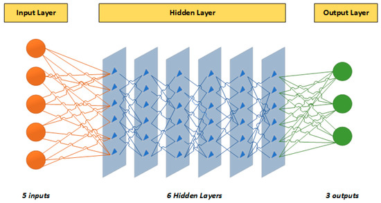 The structure of a three-layer neural network is shown in the Figure 2, where we have five inputs, six hidden layers and three outputs. The working of a simple neuron can be explained by Equation (1) [52], whereby a typical neuron computes the output in the following manner: