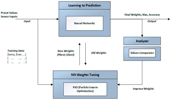Figure 3 presents the PSO-based NN model diagram. We are using neural networks for training our building energy consumption data to make predictions. PSO is used in order to fine tune and optimize weights and biases for the neural networks. It computes the particle’s positions and passes them on for the learning process. In NN-based PSO, the population of particles generated by PSO struggles its best to look for optimal weight and bias values for the neural network’s training process. The local and global positions in the PSO are updated at each iteration until the best weights are found for NN training. The analyzer checks whether best outputs are computed or more learning is needed.