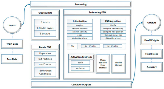 Figure 4 shows the configurations of the prediction system diagram for the PSO-based NN model. The input is divided into test and training data, training data to be trained by the PSO-based neural networks, and test data for making predictions and computing accuracy results. In the processing unit, first the neural networks and particles of PSO are created. Then the initialization for the weights, random positions and velocities of the particles ins undertaken. The PSO algorithm shuffles the particles at each iteration, and finds the new positions to be passed to neural networks for training until the best positions are found. Neural networks use two activation methods such as tanh (Equation (4), [55]) and softmax (Equation (5), [56]) for the training, and for computing the output values. The mean square (Equation (6), [57]) is computed by neural networks each time and sent back to the PSO unit for comparing whether global best value is found or not. Once the total epochs have finished running, then the final weights and biases are used to make predictions for the test data and the accuracy of the test data is computed.