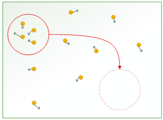 In re-generation based PSO-NN, the first step is cluster-based regeneration. In cluster-based regeneration, a close cluster of particles is found then half of the particles from the cluster are moved to some other position where no such cluster exists (Figure 5). The distances between the particles position arrays are calculated using Euclidean distance (Equation (7), [58]) to identify the clusters.