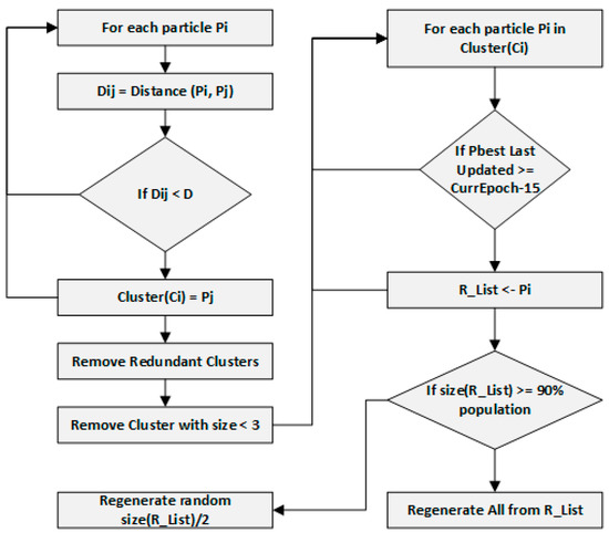 Before re-generating the particle forming a closed cluster, their past performance is checked. Particles in a cluster are not re-generated if they are all contributing to finding the global optimal value; they are moved only when stuck in local optima. Figure 6 elaborates the steps to find particle clusters and re-generate particles. Clusters are made based on the distance between them and the duplicate clusters (if any) are removed. For each particle Pi, its last updated pbest value is checked. If the last update in the pbest is found to be 15 iterations ago from current iteration, then it is added to the list of particles eligible to be re-generated (R_List). If the particles added to the re-generation list are about 90% or more of the total, then all the particles must be re-generated as they are stuck in local optima. Otherwise, half of the particles from the list are re-generated randomly to new positions.