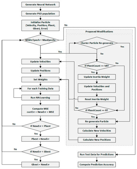 Figure 7 shows the detailed flowchart for our proposed modifications of the PSO-NN algorithm. Firstly, the neural network and PSO are generated and initialized. PSO initializes velocities, positions, pbest and gbest and error for each particle in the population. The maximum number of epochs (MaxEpochs) is the total number of iterations for finely optimizing the neural network’s weights using PSO. In each epoch, first the cluster particle regeneration possibility is checked. The detailed flow of cluster-based particle regeneration is given in Figure 6. If cluster-based particle regeneration is not done, then it checks for the performance-based velocity boost first, comparing the last update of pbest count with VBT. If the last update count equals VBT, then for the current iteration the particle’s next velocity is calculated using new inertia weight (Equation (8)). After updating velocity using the new inertia weight, the inertia weight is reset for the next iterations. The new inertia weight is only used when any particle’s last update counter condition is met. If the inertia weight isn’t updated too, then it checks for performance-based particle regeneration. The particle’s pbest last update count is compared to RT; if the last update count equals RT then, assuming the particle to be stuck at position with further improvement in pbest possible, the particle is regenerated to a new position. Upon re-generation, the re-generation counter for the particle is reset.