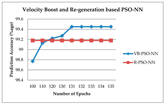 The R-PSO-NN approach, while it increases accuracy and decreases the number of epochs, still is not as efficient as V-PSO-NN (Table 1 and Figure 16). One of the reasons could be the far re-generation of particles from possible solution positions most of the time. The particle re-generation involves a random factor and we are not fully controlling the re-generation position of the particle. While in V-PSO-NN the accuracy is higher with a drastic decrease in the number of epochs, we have carefully developed an equation for velocity boost after using multiple combinations of the equation constants and have fine-tuned the VBT value after experimenting with different threshold values. Hence, for V-PSO-NN, we can conclude that our fine-tuned parameter values allow the particle to make a quick move towards the right direction before it moves towards a non-solution direction or towards getting trapped in local optima.